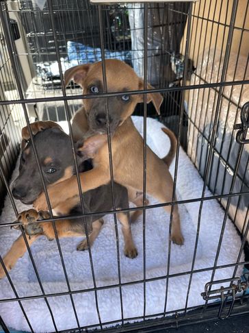 Two puppies out of a group of homeless animals that needed help getting to LTAR.